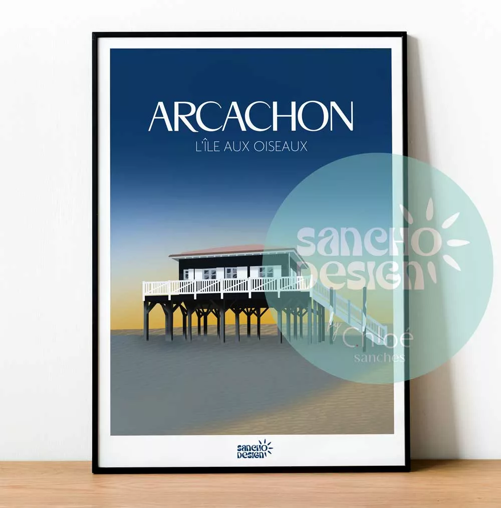 Cette affiche met ainsi en valeur la cabane sur pilotis aux volets blancs, avec un magnifique coucher de soleil aux couleurs bleu et orange.