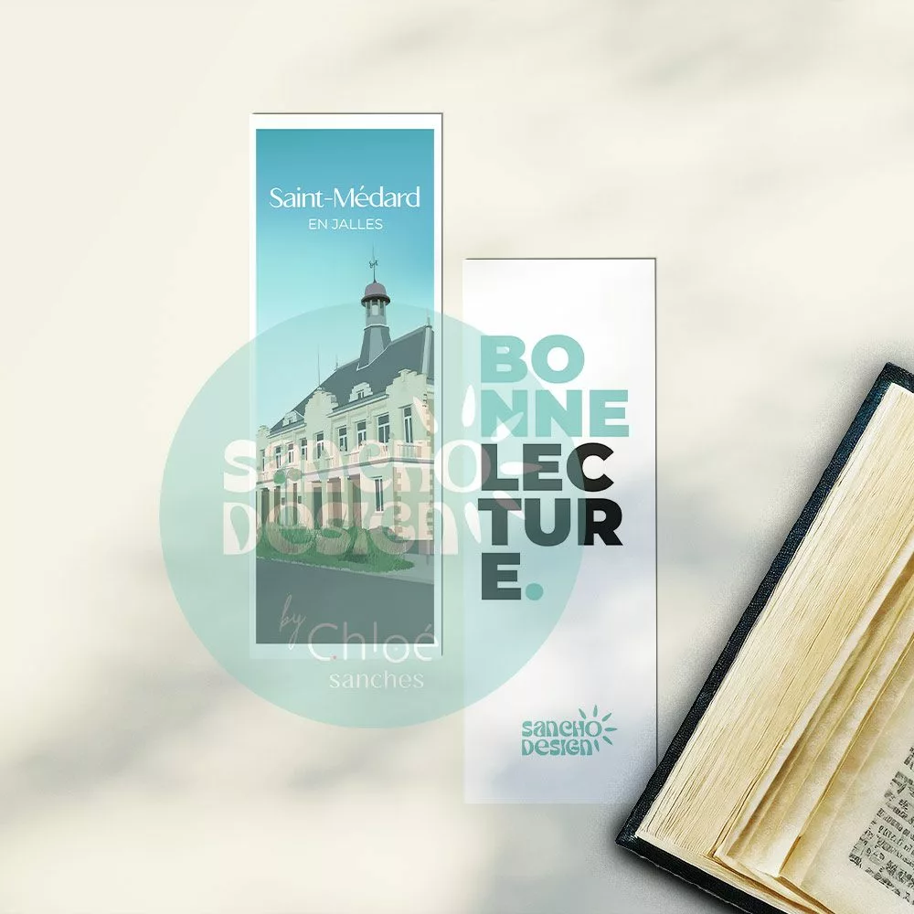 Un marque-page de la ville de Saint-Médard-en-Jalles, mettant en avant sa belle mairie et son église.