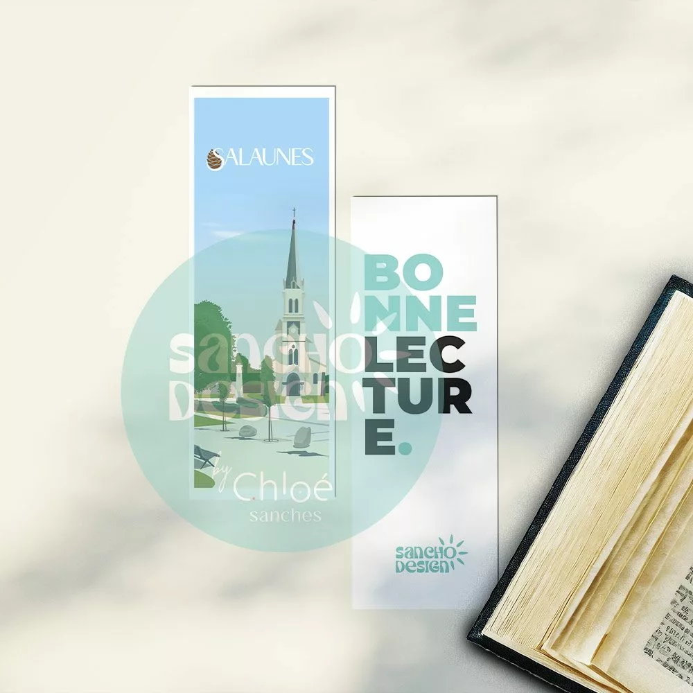 Un marque-page de la ville de Salaunes, qui met en avant la place principale de cette petite commune. Elle est principalement représentée par l’église Notre-Dame de Salaunes, mais aussi par la tour des pompiers aperçu en arrière-plan.