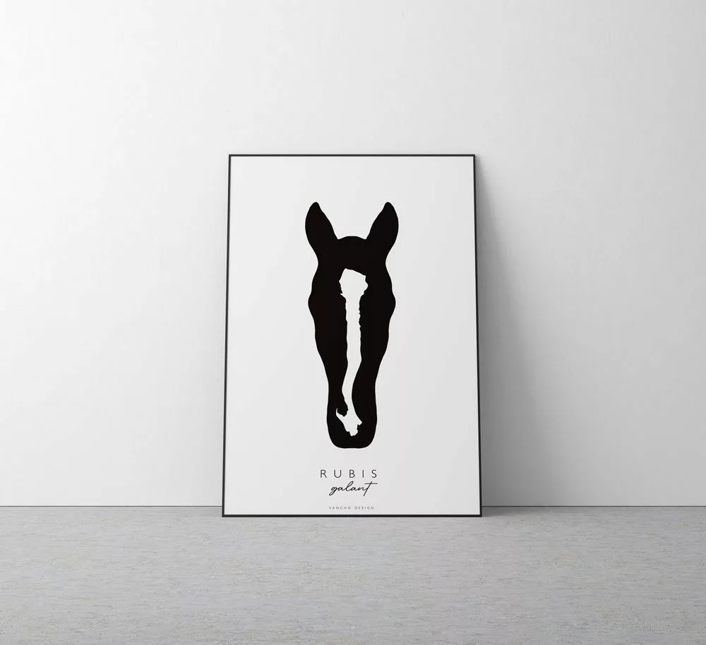 Un poster minimaliste réalisé à partir d’une photo de votre cheval, mettant en avant les potentielles taches colorées (ou non) présentent sur sa tête.